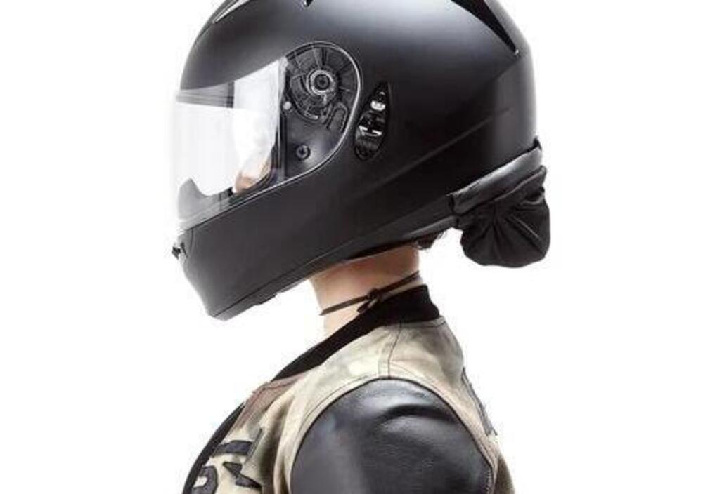 Per questo Hightail Hair propone questa sorta di sacchettino da fissare al casco e da applicare alla base della nuca per raccogliere le chiome e tenerle al sucuro da vento e intemperie. Si adatta a qualsiasi casco, è poco ingombrante e sicuramente efficace ma... per le biker che comunque tengono al loro aspetto e alla loro femminilità anche in sella diciamo che non è esattamente bello da vedere. Ma mentre guidate, lo vedete?