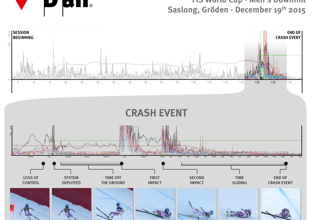 Il Dott. Gabl ha confermato che "il D-air Ski abbia molto probabilmente evitato all'atleta ulteriori traumi al torace". Dainese ha presentato i dati relativi alla caduta, evidenziando che l'impatto con il terreno è avvenuto ad una velocità di 109 km/h, generando accelerazioni fino a 13G con ripetuti e violenti impatti con la pista, come è visibile nelle schede che vi mostriamo in gallery.