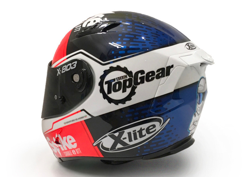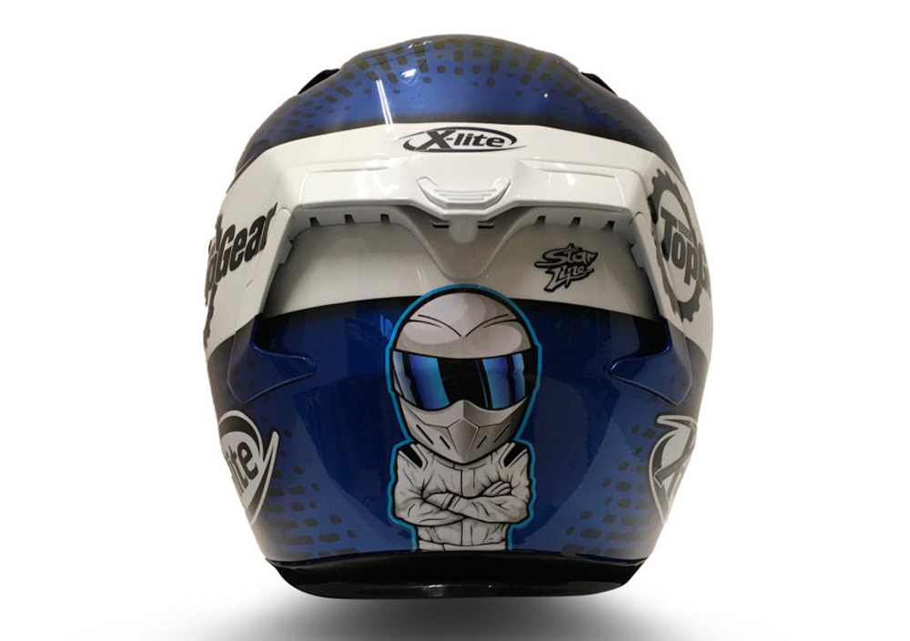 L’inedita livrea, realizzata da Starline sul casco X-lite X-803, riprende il logo Top Gear insieme a linee e tratti decisi che richiamano il mondo dei circuiti e dell’alta velocità. Sul retro spicca The Stig in versione fumetto, pronto a sfidare tutti gli avversari.