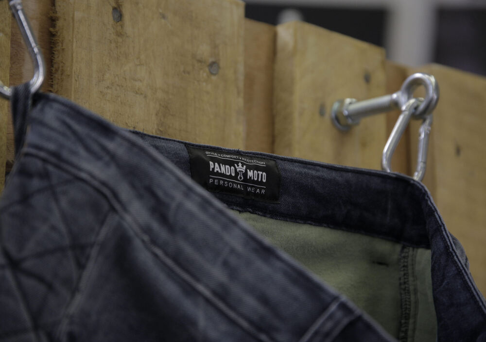 Quello che più ci ha interessato, oltre all'accuratezza con cui sono realizzati tutti i capi, è l'utilizzo di un nuovo tipo di fibra utilizzata da Pando Moto per la produzione di uno dei suoi jeans, il Boss 105 Ballistic: si tratta della dyneema, una fibra 15 volte più resistente dell’acciaio. Abbiamo cercato di strappare un campiocino del tessuto, già pre-tagliato per facilitarci l'impresa, ma è stato del tutto inutile, il jeans Boss è davvero 15 volte più resistente dell'acciaio,