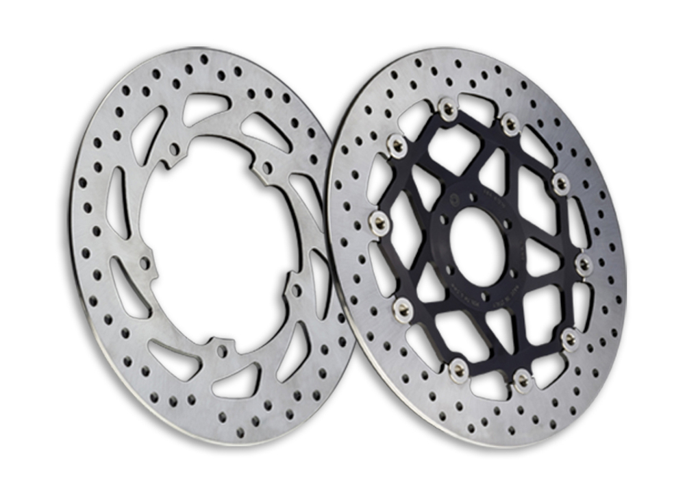I Flottanti hanno la fascia frenante in acciaio Inox collegata attraverso dei nottolini di trascinamento alla campana realizzata in lega di alluminio, lavorata CNC e successivamente anodizzata.