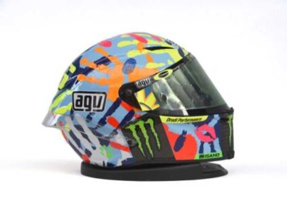 Per le più sportive, e soprattutto fan del buon Valentino (quante siete?!), AGV propone una grafica decisamente unica, replica esatta di quella utilizzata da Rossi durante la FP3 della gara di Misano lo scorso 13 settembre: nella parte bassa del casco, al livello della mentoniera, si legge una frase ispirata ad un famoso jingle pubblicitario italiano che diventa il motto: “Misano, ci dà una mano”. Sulla parte alta della nuca sono presenti il 46 giallo e il logo AGV, elementi distintivi che hanno affiancato Valentino nella sua carriera. Con il numero 58 un pensiero va anche al suo grande amico Marco Simoncelli. Sullo sfondo azzurro troviamo disegni dai colori brillanti e fluo. Un tripudio di colore, un casco quasi infantile che ricorda i giochi da bambino, ma decisament adatto anche ad un pubblico femminile.