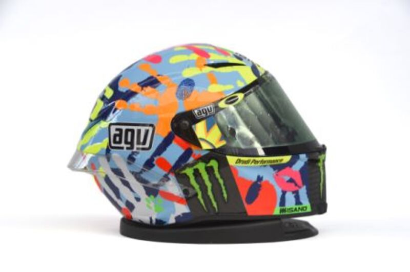 Le impronte disegnate sono quelle delle mani dei meccanici del team Movistar Yamaha MotoGP, pronti ad aiutare Vale in questa gara, con la loro esperienza e capacità. Non manca qualche particolare divertente, come le zampe dei suoi adorati cani Cesare e Cecilia e novità del suo gatto rosso Rossano, il segno delle labbra delle donne della sua vita, mamma Stefania e il bacio stampato della fidanzata Linda.
