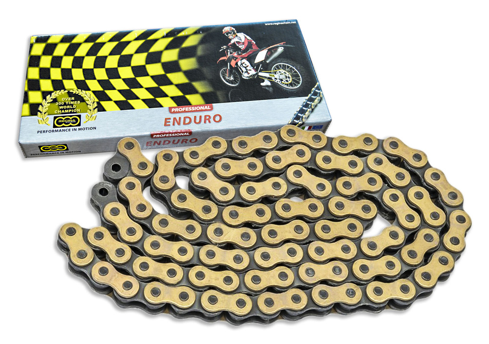 Inoltre le catene ZR presentano perni e piastre in lega di acciaio speciale, bussole estruse, rulli estrusi, pallinatura di piastre, perni e rulli, precarico di assestamento e piastre esterne color oro.