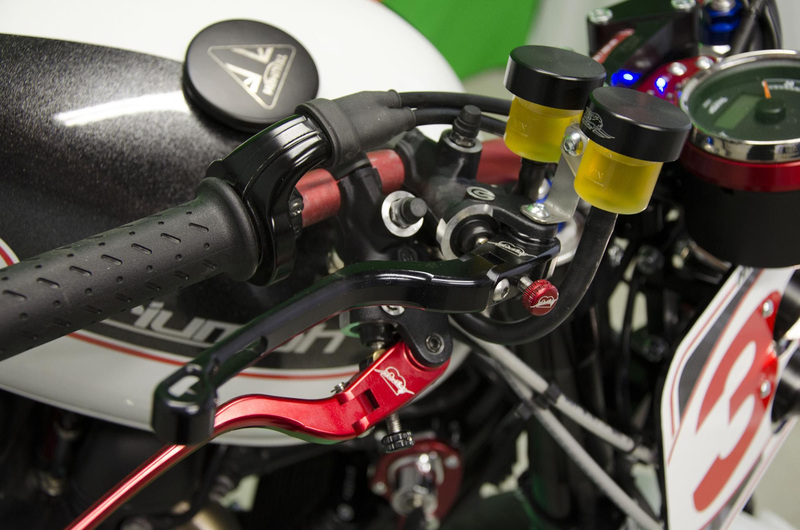 Per migliorare ulteriormente abbiamo cambiato la geometria della moto grazie a dei riser block di nostra produzione permettendo di spostare il peso in avanti e diminuire cosi l’avancorsa. Se c'è una cosa importante per gli stunt è proprio la possibilità di gestire i vari trick attraverso un perfetto impianto frenante. All'anteriore sono stati installati due dischi Newfren da 340 mm, morsi da pinze radiali Brembo. Questa configurazione assicura una frenata potente adatta allo stoppie più estremo! Per il posteriore invece è stato studiato un kit che permette il montaggio della classica doppia pinza da Stunt, che in questo caso vanno a stringere il disco Newfren da 300 mm. Le due pinze vengono comandate rispettivamente dal pedale destro (come avviene solitamente sulle moto) e da una leva freno Bolcato Racing snodata e regolabile, montata sul manubrio. Una soluzione assolutamente inconcepibile per il motociclista comune, ma fondamentale per lo stuntman!