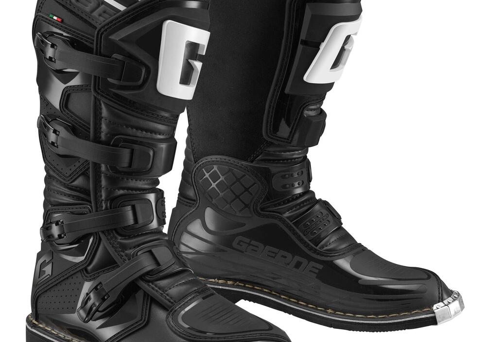 Protezioni esterne in materiale termoplastico, studiate per dare maggior sostegno nella zona dei malleoli e pelle scamosciata nella zona interna del polpaccio per proteggere dal calore della moto.