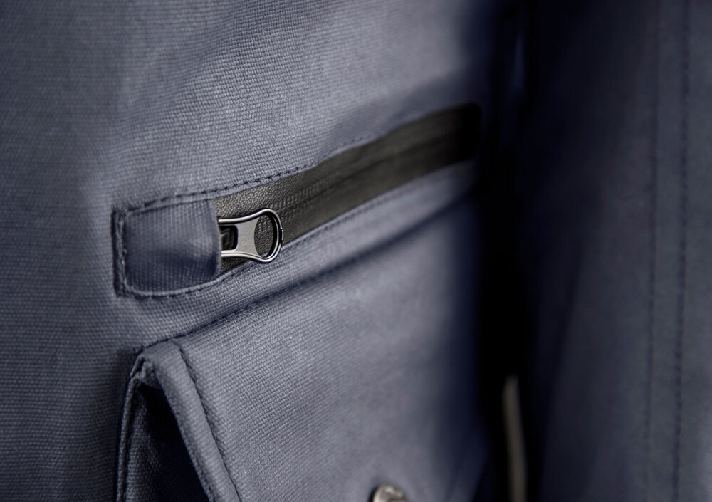 Le tasche sono tutte frontali, quattro con taglio a tascone, chiuso con bottone e strap, e due con zip, internamente impermeabili.