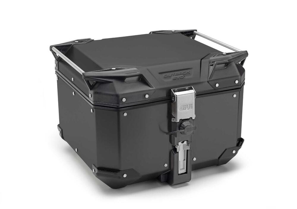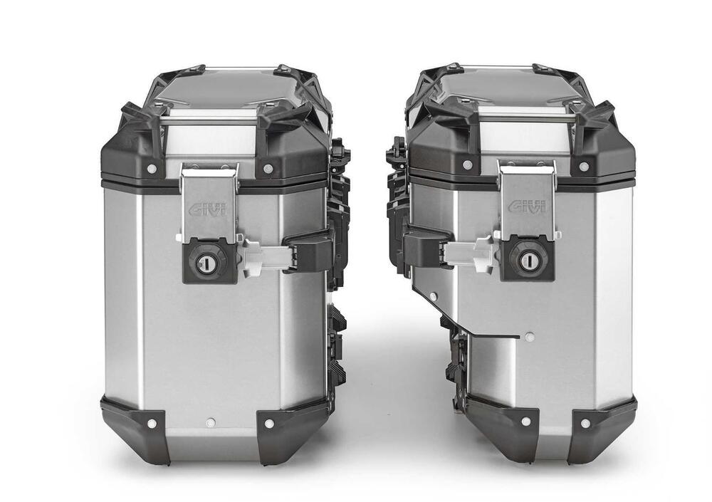 Disegno della struttura a parte, la nuova scantonata riprende dalla valigia standard da 37 litri tutta la dotazione tecnica che rende questa linea la top di gamma delle proposte in alluminio di GIVI. Dal sistema di rotazione del coperchio (Detachable Lid System), rinforzato in acciaio inossidabile, che permette di definirne il fermo e la completa rimozione dello stesso… al sistema a uncino (Hold it Active System) che permette di inclinarla senza doverla sganciare completamente dal supporto laterale, agevolando l’apertura del coperchio in presenza di un topcase.