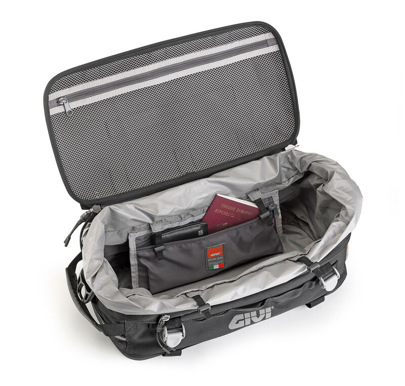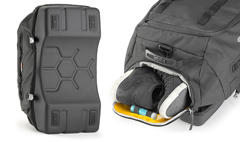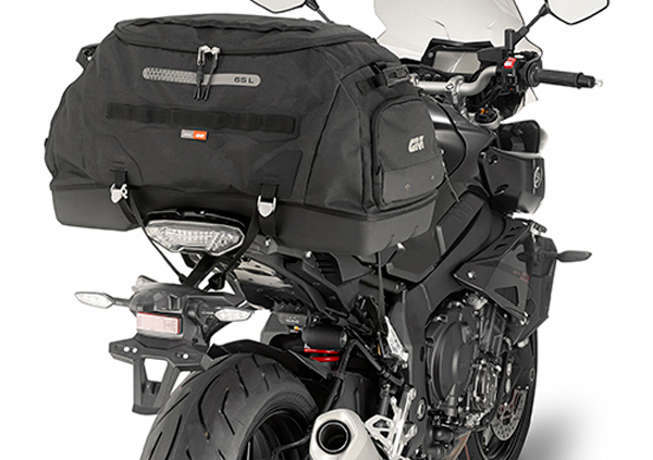 Se i 65 litri offerti dal borsone non bastano, GIVI ne suggerisce il gemellaggio con l’UT807, compatta borsa cargo da 20 litri (espandibile) che si fissa sopra l’UT806 (ma trova posto anche sui coperchi delle valigie laterali squadrate e sui “portapacchini” montati sui top-case, ma viaggia anche da sola su supporti supplementari, portapacchi posteriori e sulla stessa sella passeggero).