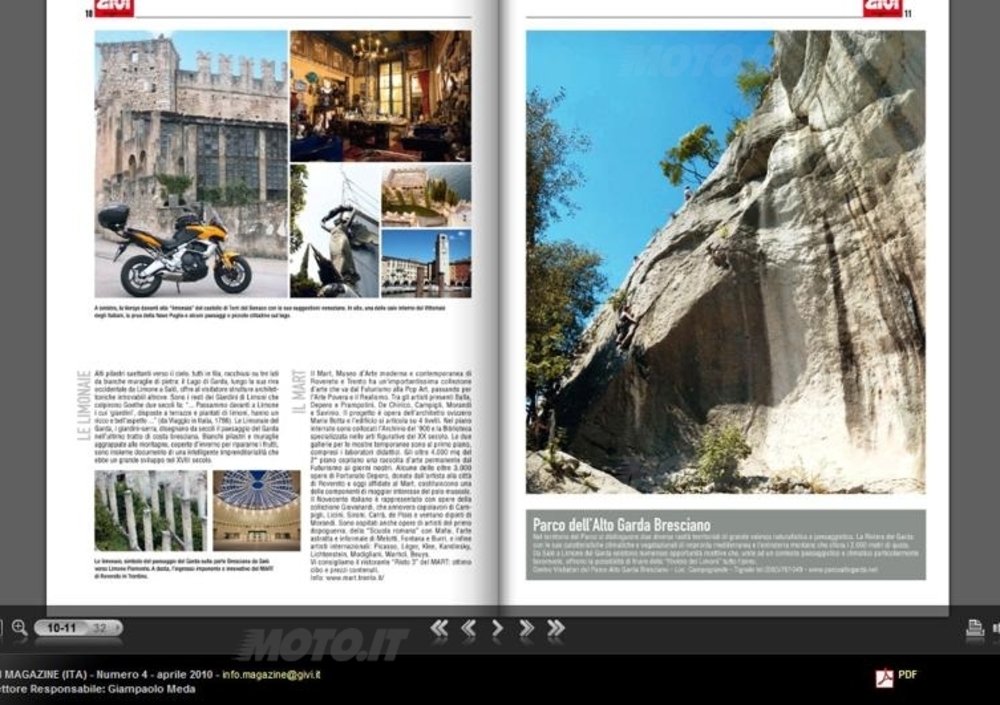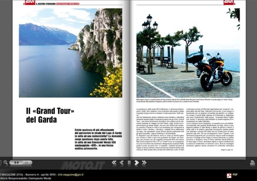La GIVI è una realtà moderna e perfettamente al passo coi tempi, e, in quanto tale, aperta ad ogni tipo di comunicazione con l’utente finale. Ne è un esempio GIVI Magazine, il trimestrale di 32 pagine dal taglio internazionale – tra l’altro è disponibile in tre lingue - consultabile sul sito www.givi.it , il cui numero attualmente online si presenta con una piacevole serie di novità: ora infatti è sfogliabile, e permette di “zoomare” sulle pagine per facilitare ulteriormente la lettura; inoltre la grafica è stata resa più fresca e piacevole, come si conviene ad un moderno organo di informazione che si occupa anche di turismo.