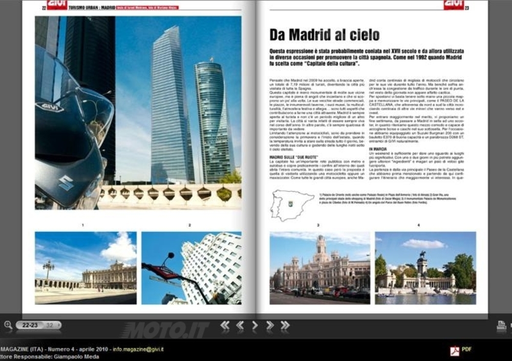 La copertina di questo numero, aperto dall’editoriale di Hendrika Visenzi, “strilla” l’accattivante servizio sulla splendida Madrid, raccontata nel corso di una visita in scooter. Ma all’interno troverete anche il “Grand Tour” del Lago di Garda in sella a una Kawasaki Versys. Troverete anche un’interessante intervista a Didier Mayer, uno dei guru del web motociclistico francese, e molti altri argomenti inerenti al nostro mondo, prodotti e shopping motociclistico compresi. Buona lettura!