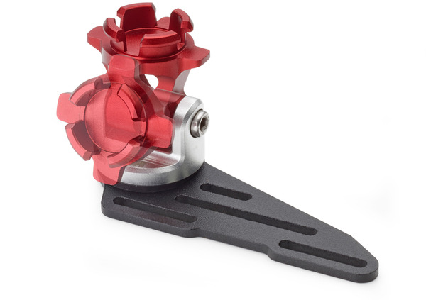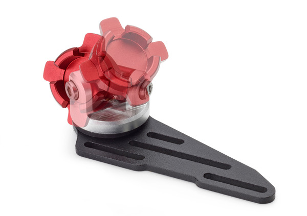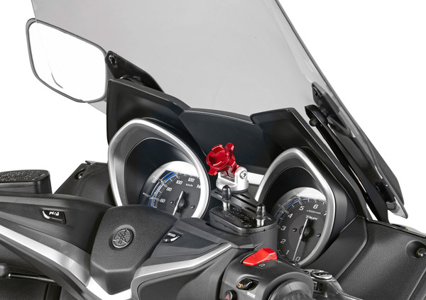 L’accessorio lascia un’ampia libertà di regolazione: la basetta di supporto è orientabile e reversibile; la parte centrale permette la rotazione sull’asse verticale mentre il componente superiore, messo in evidenza dal colore rosso rubino, può farlo sull’asse orizzontale. A quest’ultimo elemento è possibile fissare i porta GPS/smartphone S952B, S953B, S954B, S955B, S956B, S957B (le caratteristiche nell’area “Accessori” del sito web di GIVI).