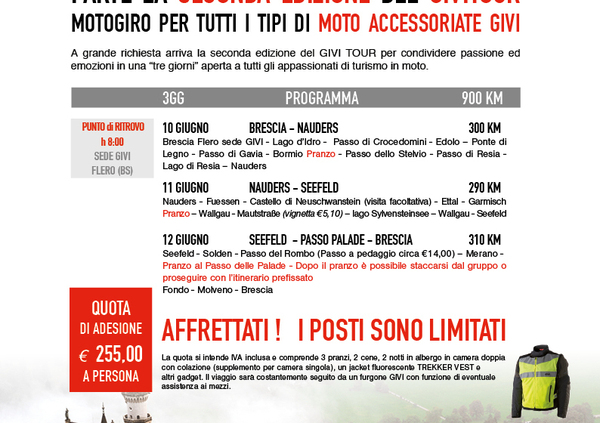 E’ stabilita in 255 euro a persona e comprende vitto e alloggio (in camera doppia) per l’intero tour, un jacket fluorescente “TREKKER VEST” e altri gadget. Un furgone GIVI, attrezzato per fornire eventuale supporto e assistenza ai mezzi, seguirà il tour.