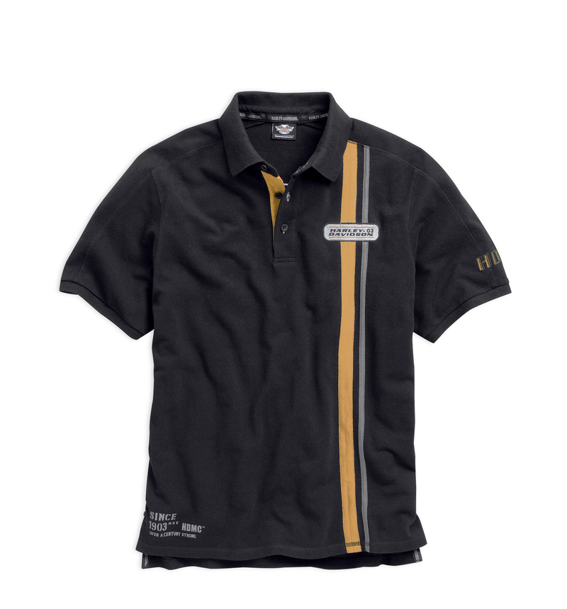 Polo in puro cotone pique con chiusura a tre bottoni. La personalità della proposta spicca nelle bande verticali con colori a contrasto e nei ricami Harley-Davidson®. Taglie disponibili dalla S alla 5XL. Prezzo al pubblico consigliato Iva inclusa 90,00 Euro.