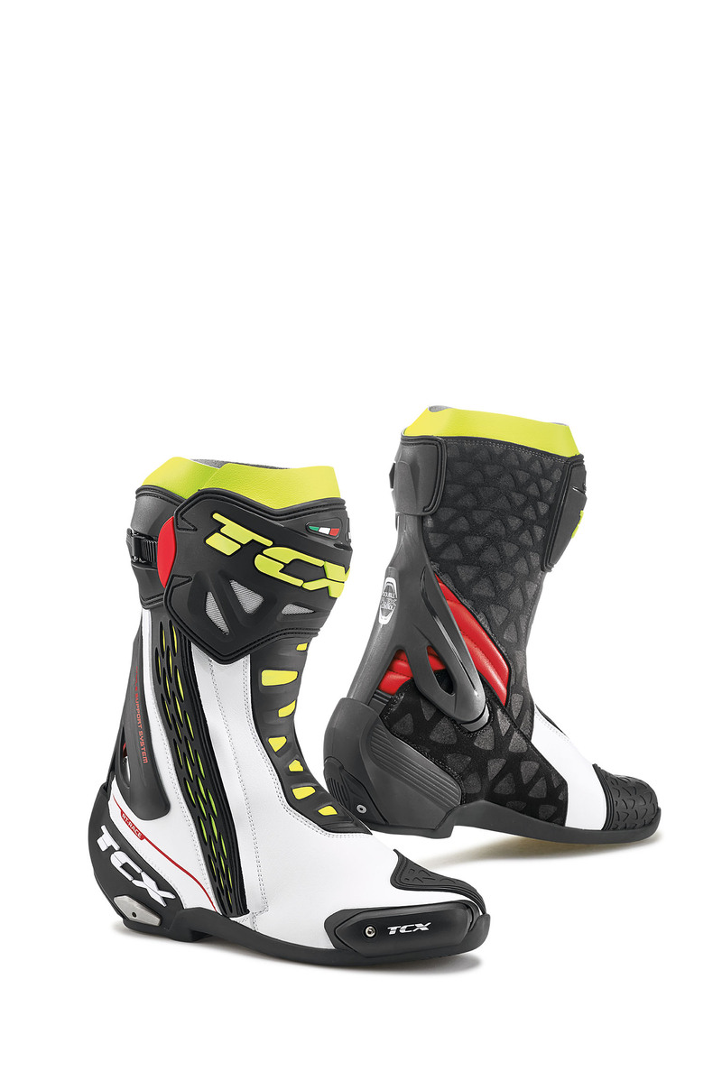 Ha bisogno di un bel paio di stivali che lo facciano sentire un vero pilota. Ci pensa TCX con i nuovissimi RT Race, stivale della linea racing e dal design nuovo e aggressivo, idoneo per un utilizzo stradale ma performante anche in caso di impiego su pista. Lo stivale presenta una forma snella nell’area della punta ed un nuovo design della suola. La precisione di calzata ed una maggiore sensibilità durante la guida sono favoriti dalla presenza del Fasten Fit Control, un sistema di allacciatura interno, collegato alla fodera dello stivale attraverso un laccio ad alta tenacità, che consente il massimo avvolgimento della tomaia al piede. Per facilitare ulteriormente l’ingresso del piede, la zip è stata posizionata esternamente ed è abbinata ad un pannello in materiale elastico, sovra iniettato. Ad assicurare una perfetta chiusura dello stivale nell’area della tibia è presente una leva micro-regolabile in alluminio, a sgancio rapido, disegnata per adattarsi perfettamente alle differenti anatomie del polpaccio. La tomaia, realizzata in microfibra durevole, è arricchita da dettagli tecnici come la sovra-iniezione su materiale elastico nella parte anteriore e laterale dello stivale che ne definiscono lo stile preciso e dinamico; la fodera interna è in materiale Air Tech traspirante e presenta un’imbottitura a spessori differenziati posizionata nell’area della caviglia per offrire il massimo confort. RT-Race è dotato del nuovo sistema Double Flex Control, uno snodo in poliuretano posizionato nell’area della caviglia capace di offrire un’ottimale flessibilità dell’articolazione avanti/indietro. Il sistema è ancorato al gambetto dello stivale tramite due viti nascoste posizionate in corrispondenza dei malleoli.
