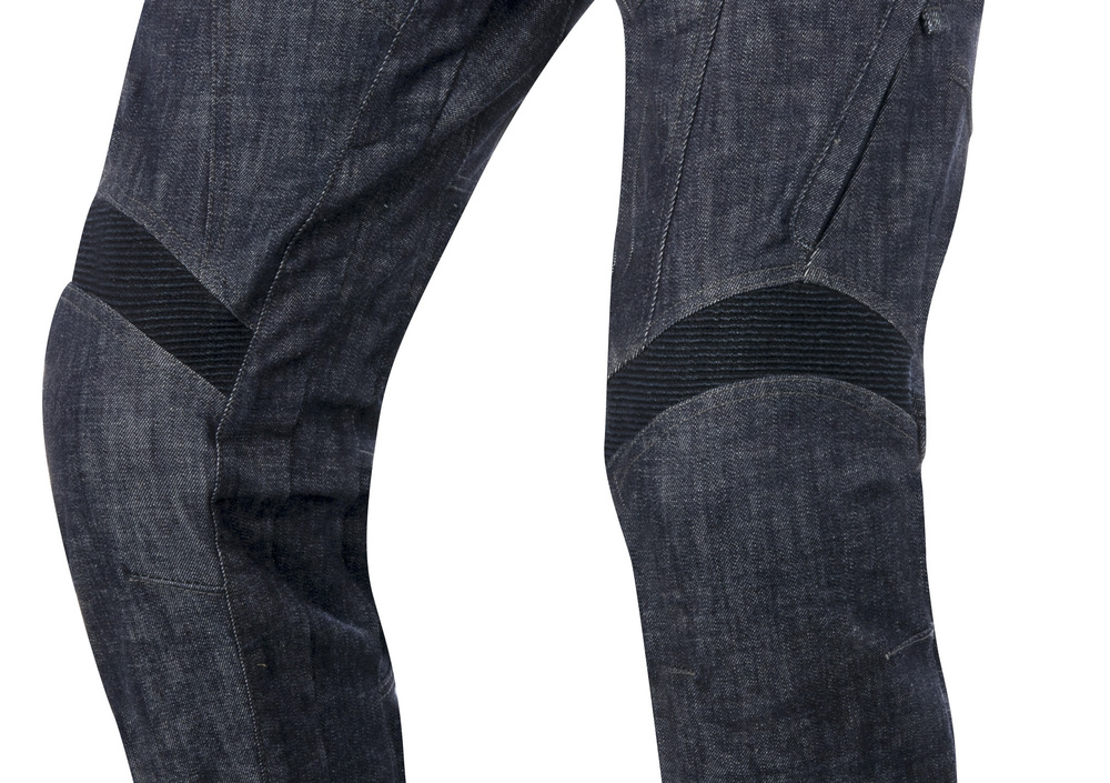 La struttura pre-curvata delle gambe e un carré in denim elasticizzato a soffietto si uniscono per rendere questi jeans una soluzione comoda per ogni motociclista, non mancao pannelli a soffietto elasticizzati in denim su ginocchia e cavallo per un maggior comfort.