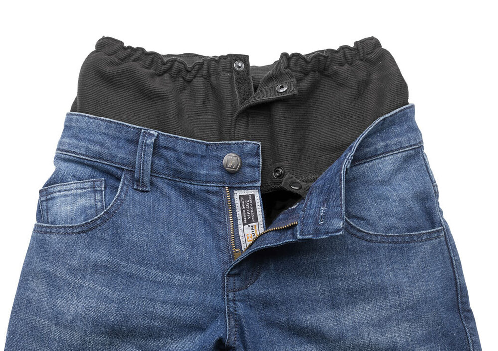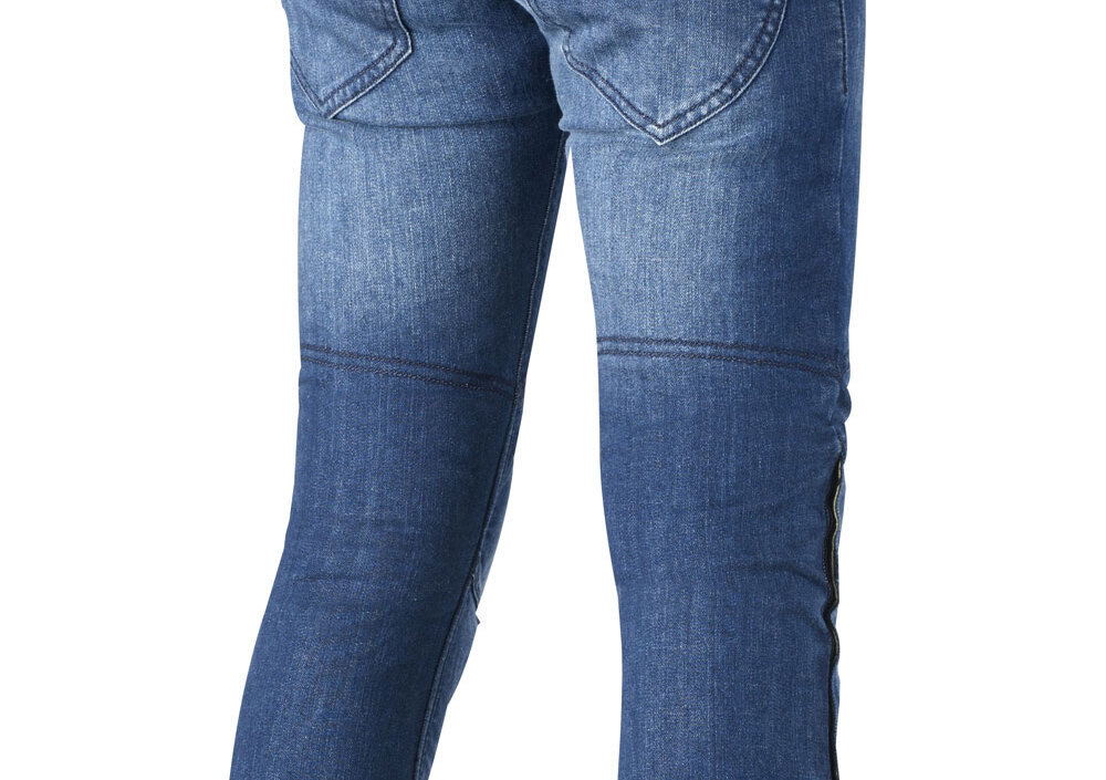 Il jeans propone un taglio di tipo BOOT CUT (leggermente svasato in basso per far posto allo stivale) e un tessuto dal look invecchiato che nasconde, nelle zone più soggette ai contatti con il terreno, una fodera di rinforzo in Kevlar. Ogni motociclista riconosce le caratteristiche di resistenza meccanica alla trazione, all’abrasione e al calore, di questa particolare fibra, e di conseguenza la bontà della scelta di HEVIK.