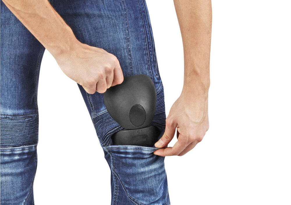 Prodotto in Denim 11,5 oz elasticizzato, il capo presenta rinforzi in fibra aramidica lungo i fianchi e fino alle ginocchia. Punti sensibili per i quali OJ ha previsto anche protettori CE EN 16-21-1 Safe Tech. Quelli posizonati alle ginocchia sono facilmente estraibili/inseribili dall’esterno e regolabili in altezza. Inserti stretch agevolano i movimenti in sella.