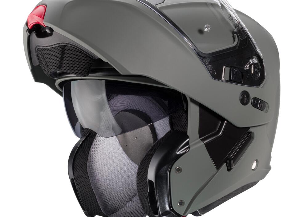 Nella dotazione di serie il modello Horus è dotato della lente antiappannante Pinlock Max Vision e della visiera parasole integrata Double Visor Tech facile da inserire grazie al comando posto sul lato sinistro del casco.