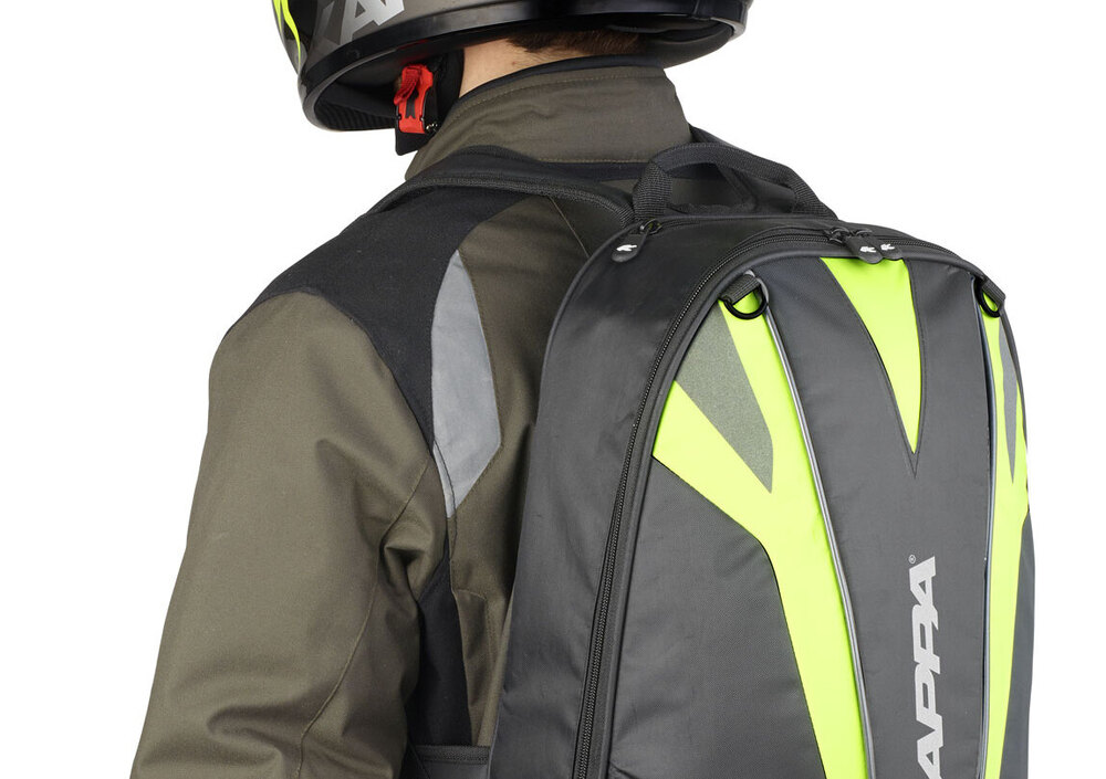 Un nuovo compatto zaino, prodotto in robusto poliestere 840D e inserti in fluorescente giallo, colore ripreso dalla copertina antipioggia alloggiata nella tasca superiore esterna e pronta all’uso. Una seconda tasca, posizionata alla base dello zaino, alloggia la borsa porta casco. L’RA312 è comodo da indossare e rimane aderente al corpo grazie a spallacci imbottiti e regolabili assistiti da cinghie - sempre registrabili - al petto e alla vita. Non manca la maniglia per il trasporto a mano. L’interno ha una capacità di 16 litri. PREZZO AL PUBBLICO: 63 euro.