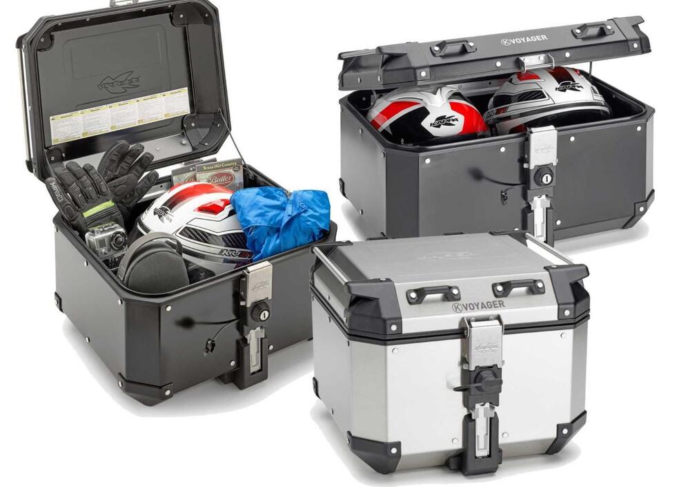 Il bauletto K’VOYAGER, disponibile da 42, 48 e 58 litri, è realizzato in alluminio in versione Natural e Black (KVG420B, KVG480B, KVG580B) e si aggancia alla moto tramite il diffusissimo sistema MONOKEY. Dalla dotazione tecnica segnaliamo le cerniere di apertura del coperchio in acciaio inox, profili, angolari e i quattro passacinghia in tecnopolimero rinforzato. E ancora le comode maniglie metalliche laterali per il trasporto a mano e la serratura Security Lock con tappo copripolvere.