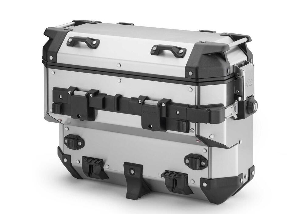 Adotta l’attacco MONOKEY CAM SIDE (compatibile con i portavaligie laterali tubolari KLO _CAM, KLOR _CAM, KL _CAM, KLR _CAM) ed è acquistabile singolarmente nelle versioni da 37 e 48 litri. Proprio come il top case, sia il corpo che il coperchio sono realizzati in alluminio, Natural e Black (KVG37B / KVG48B). La laterale riprende la dotazione tecnica indicata per il bauletto.