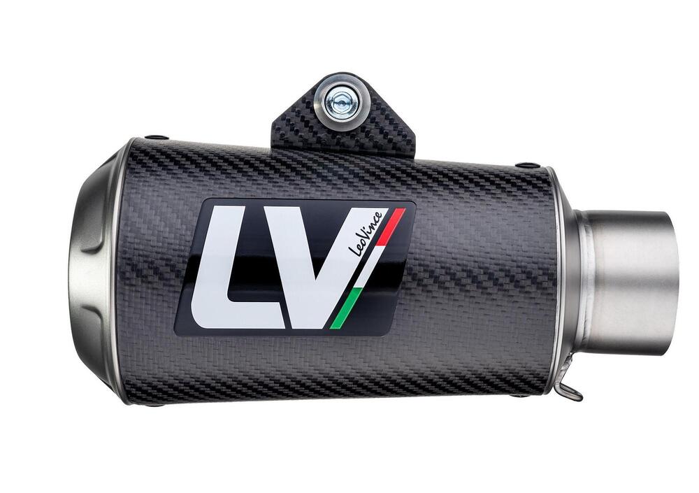LV-10 Carbon Fiber, unico nella gamma LV-10, è impreziosito da una targhetta in alluminio con in rilievo il logo LV, finora utilizzato da LeoVince esclusivamente nelle competizioni, a testimoniare il forte legame tra LV-10 Carbon Fiber e la pista.