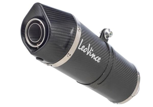 Lo scarico in carbonio invece contrasta i toni scuri con un adesivo LeoVince in alluminio, fustellato, resistente alle alte temperature, brillante e ben visibile sulla fibra di carbonio.