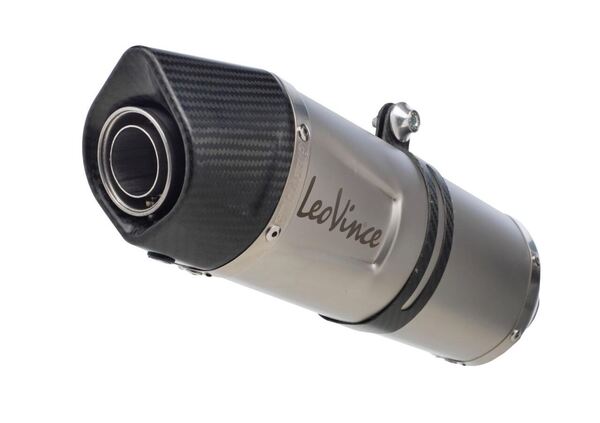Nella versione in INOX il logo LeoVince è realizzato con marcatura a laser, e spicca da un bassofondo assolutamente inedito: il marchio italiano è impresso sullo scarico come un taglio scavato nel corpo silenziatore. Il marchio graffia lo scarico come una fiamma sfumata, ispirando velocità e potenza.