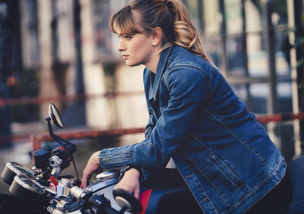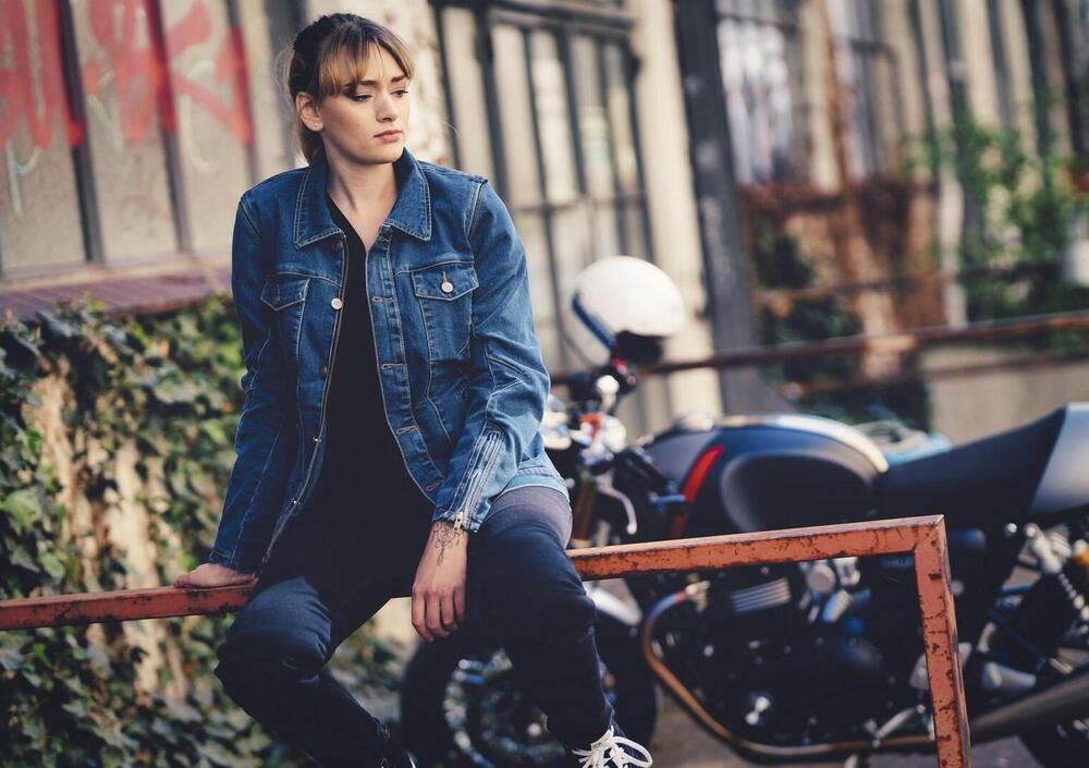 Giacca di jeans da donna con taglio aderente e denim elastico che offre un'eccellente libertà di movimento. Molto alla moda, non trascura gli aspetti di sicurezza: protezioni regolabili su spalle e gomiti, cuciture di sicurezza, tasca per paraschiena (optional). Il tessuto denim è resistente all'abrasione.