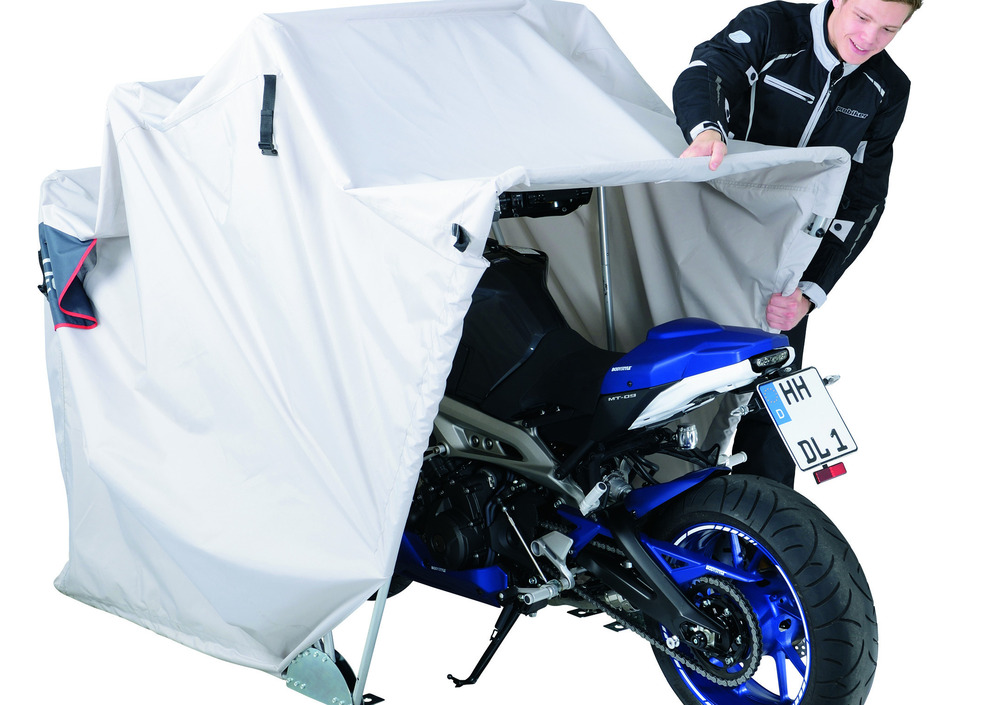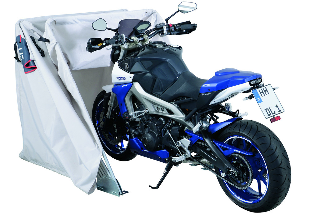 Il garage pieghevole è così ampio 119X170X302 (larghezza - altezza - lunghezza) in taglia M, da poter ospitare anche le moto più grandi con accessori come portabagagli, borse, parabrezza o componenti analogamente voluminosi.