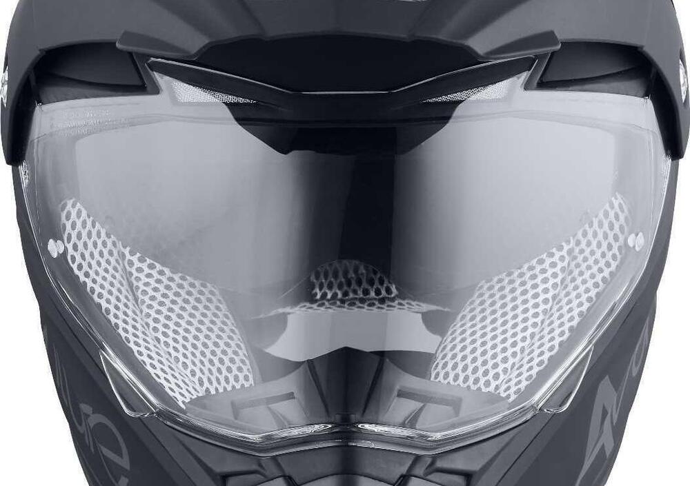 Calotta in ABS e finiture comfort, parasole integrato, numerose prese d'aria, lente interna antiappannamento Pinlock.