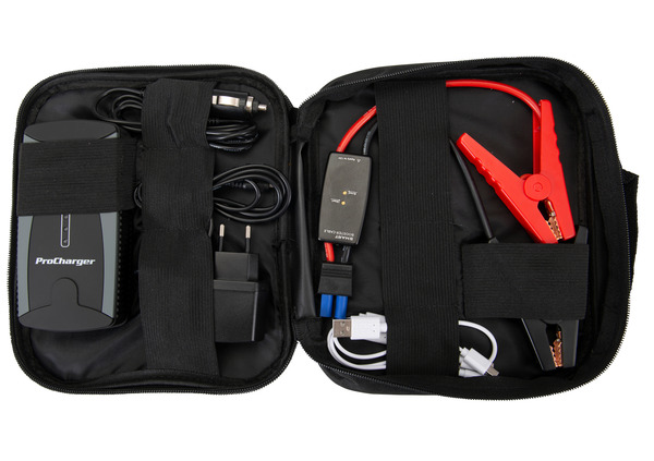 La fornitura comprende: Avviatore di emergenza e power bank, cavo dei morsetti, batteria per l'avviamento d'emergenza, USB, caricabatteria da parete, borsa.