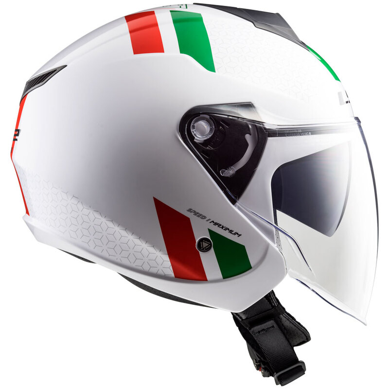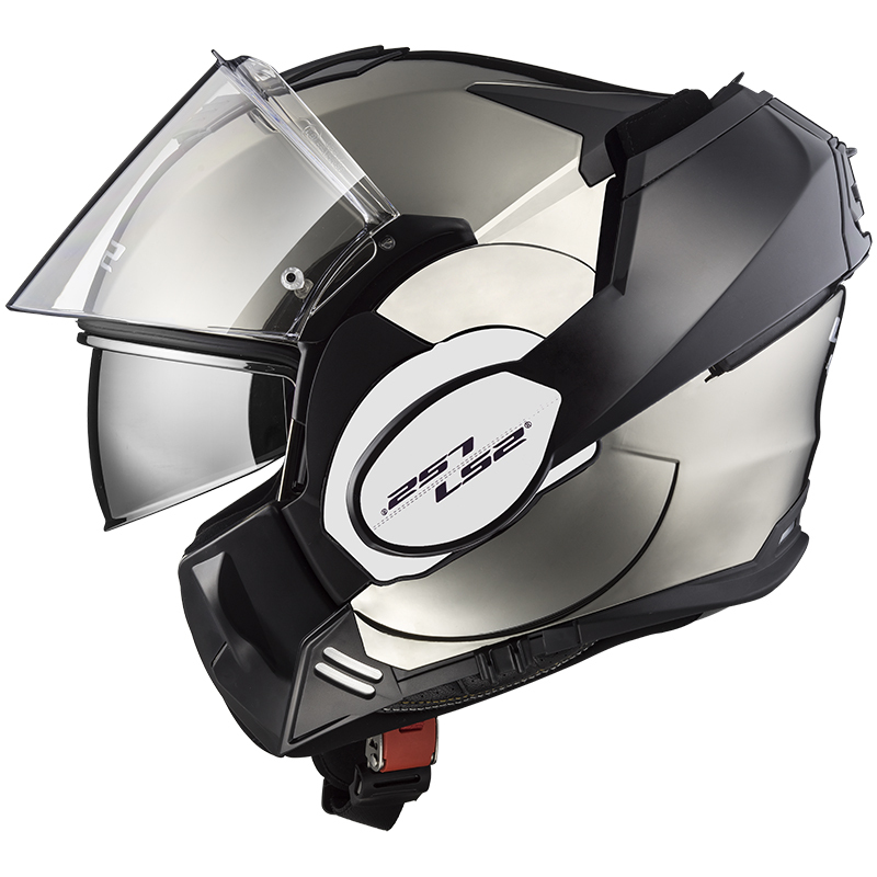 Valiant FF399 si presenta con un meccanismo di apertura brevettato daLS2, con la mentoniera che si può facilmente sollevare grazie ad un unico tasto, presente al centro della parte inferiore interna, che aziona un meccanismo studiato con l’obiettivo di evitare ogni tipo di apertura accidentale. Una volta sollevata, la mentoniera prosegue la sua corsa di 180°, fino a raggiungere la parte posteriore della calotta, dove si blocca. Con un solo tocco, è anche possibile regolare il flusso d’aria dalla mentoniera che può essere indirizzato alla visiera o verso la bocca. Una volta chiusa, la mentoniera diventa solidale con il casco, garantendo la stessa sicurezza di un casco integrale. Valiannt FF399 è infatti omologato sia come casco aperto che come casco integrale (come da sigla PJ riportata nell’etichetta posteriore).