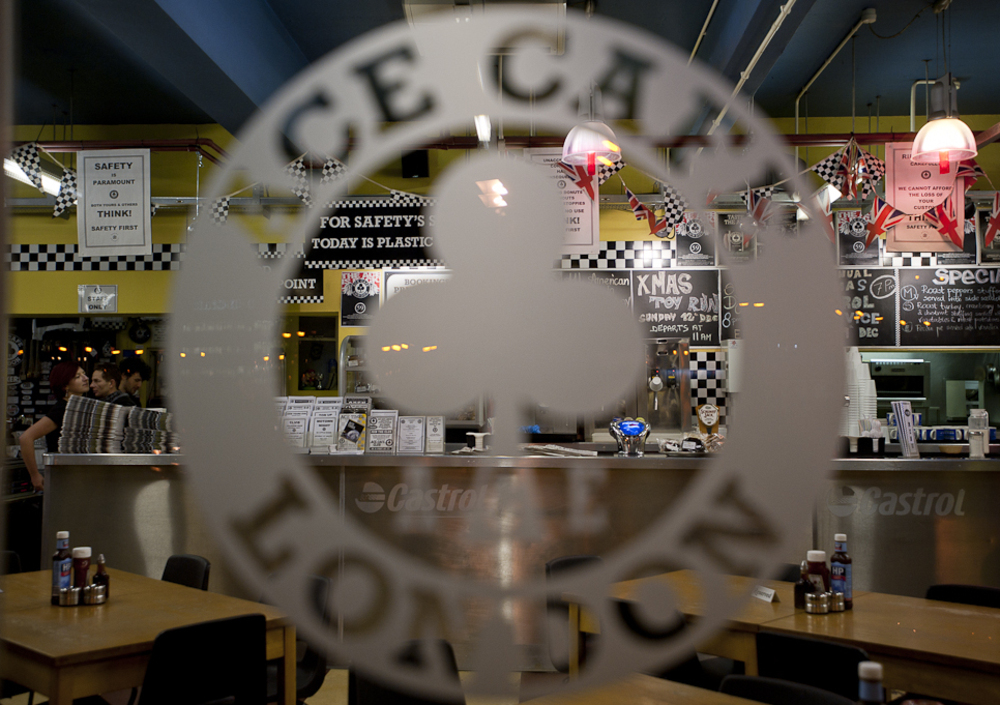 Costruito nel 1938 per dar ristoro agli automobilisti di passaggio nel traffico della nuova Circonvallazione Nord di Londra, l’Ace Cafè non impiegò molto ad attrarre anche numerosi motociclisti, che ne fecero una delle loro mete preferite e luogo di incontri e affollati raduni. Durante la Seconda Guerra Mondiale, il locale fu inevitabilmente danneggiato dai numerosi bombardamenti, ma venne presto ricostruito per riaprire i battenti nel 1949 con la licenza di ristorante ed art cafè. La sempre crescente popolarità fra il popolo dei motociclisti britannici, nell’immediato dopoguerra, portò l’Ace Cafè all’attenzione anche di vari piloti e, naturalmente, dei media. Erano gli anni in cui l’industria motociclistica inglese era al suo apice, proprio quando venne introdotto un nuovo stile di musica, il Rock ‘n’ Roll, da subito proibito alle radio, che poteva essere ascoltato solo nei jukebox dei bar delle stazioni di servizio. E così il Rock ‘n’ Roll arrivò anche al jukebox dell’Ace Cafè, che continuava a riprodurre nuove canzoni tutte le sere. E, insieme alla musica, arrivarono sempre più motociclisti. L’unione tra musica e metalloportò a leggende (vere) come quelle del ‘record-racing’ (gara del disco): i motociclisti dovevano inserire una moneta nel jukebox e tentare di correre fino ad un punto e tornare indietro prima che finisse la canzone, che solitamente era un classico di allora e di sempre: Rock Around The Clock, di Bill Haley.