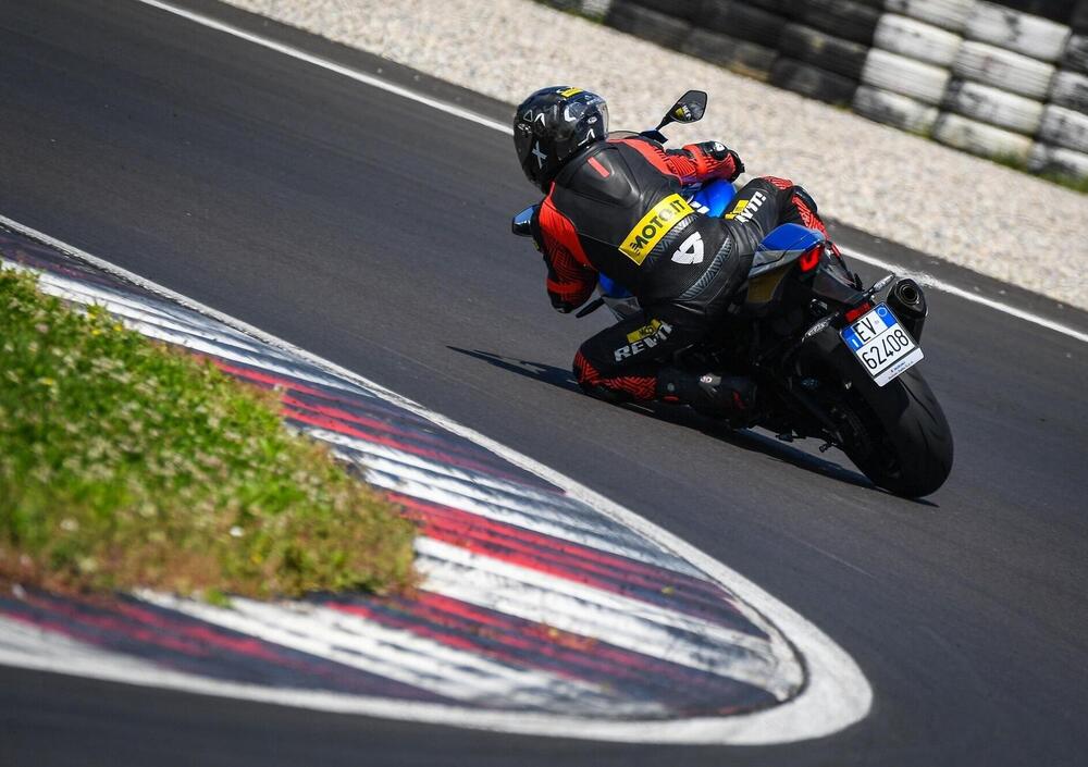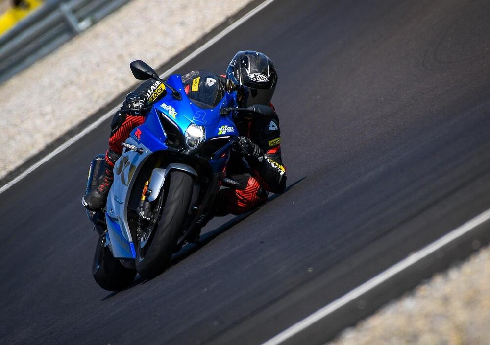 Fatte le pressioni, quindi su consiglio del tecnico Mitas scendiamo da quelle consigliate da Suzuki per uso stradale fino ad arrivare a 1.7 posteriore e 2,1 anteriore, a freddo, siamo entrati in pista.