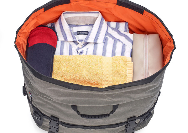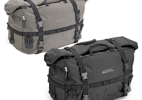 Esternamente troviamo un tessuto idrorepellente testato per resistere ai raggi UV, internamente una fodera waterproof in un bell’arancione. Il volume è modulabile grazie all’azione offerta dal sistema MML e dalla cinghia regolabile verticale. Il fissaggio a sella, top case o portapacchi avviene tramite altre 4 cinghie che, una volta staccata la borsa, si agganciano tra loro. Non mancano le maniglie di trasporto. Le borse sono disponibili in due varianti colore: nero e grigio.