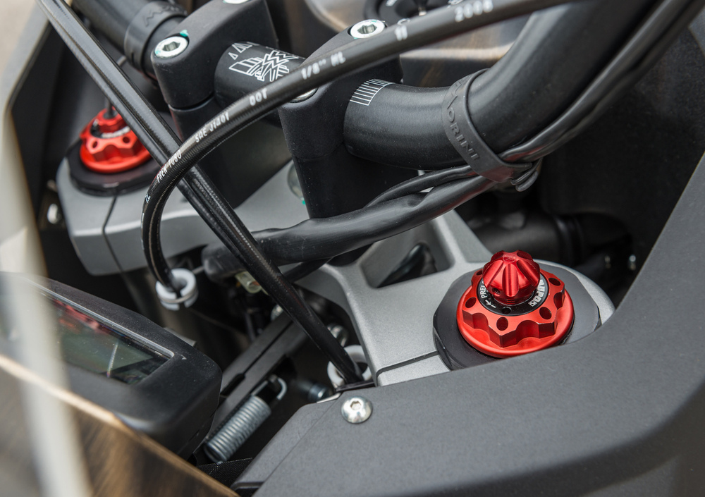 Iniziamo il test con le sospensioni standard, ritrovando l’assetto che conosciamo sulla crossover italiana – piuttosto sostenuto sul retrotreno e invece più morbido sulla forcella – studiato per gestire l’esuberanza del bicilindrico Corsacorta. Sullo sconnesso emerge una buona precisione ma un comfort ridotto nel gestire le asperità, con una risposta controllata ma evidentemente rigida. La contropartita è naturalmente una bella precisione su fondi regolari e sul veloce, gratificante nella guida sportiva ed efficace quando si forza un po’ il ritmo.