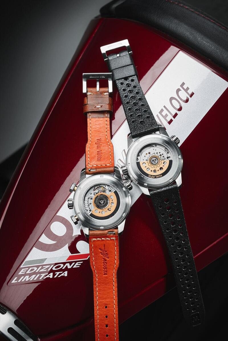 Il fondello a vite, con vetro zaffiro trasparente, consente di ammirare il movimento automatico, un vero motore a vista. La massa oscillante riprende il logo MV al centro ed è proposta nel colore del rotore in alluminio anodizzato delle moto, insieme al logo Wyler Vetta.