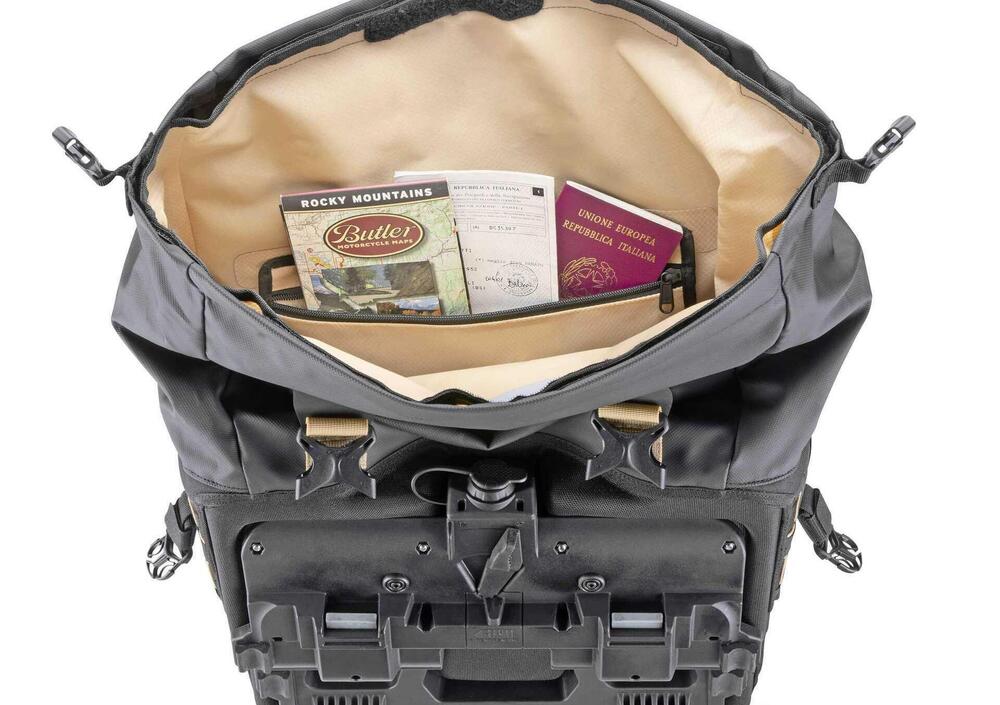 Robusta e pensata per l’avventura, utilizza materiali antiabrasione e antiurto, con rinforzi interni removibili. Il sacco interno waterproof con chiusura roll-top garantisce impermeabilità totale anche in condizioni estreme. La patella frontale removibile in Hypalon protegge la borsa dagli impatti, mentre il sistema M.O.L.L.E. permette di ampliare il carico con accessori aggiuntivi.