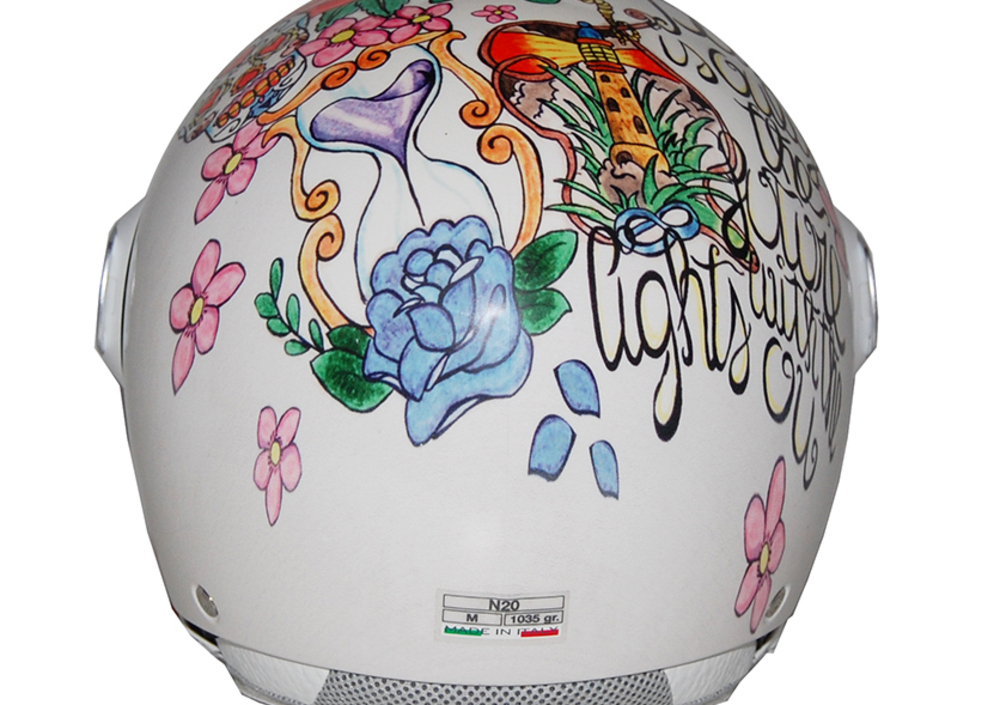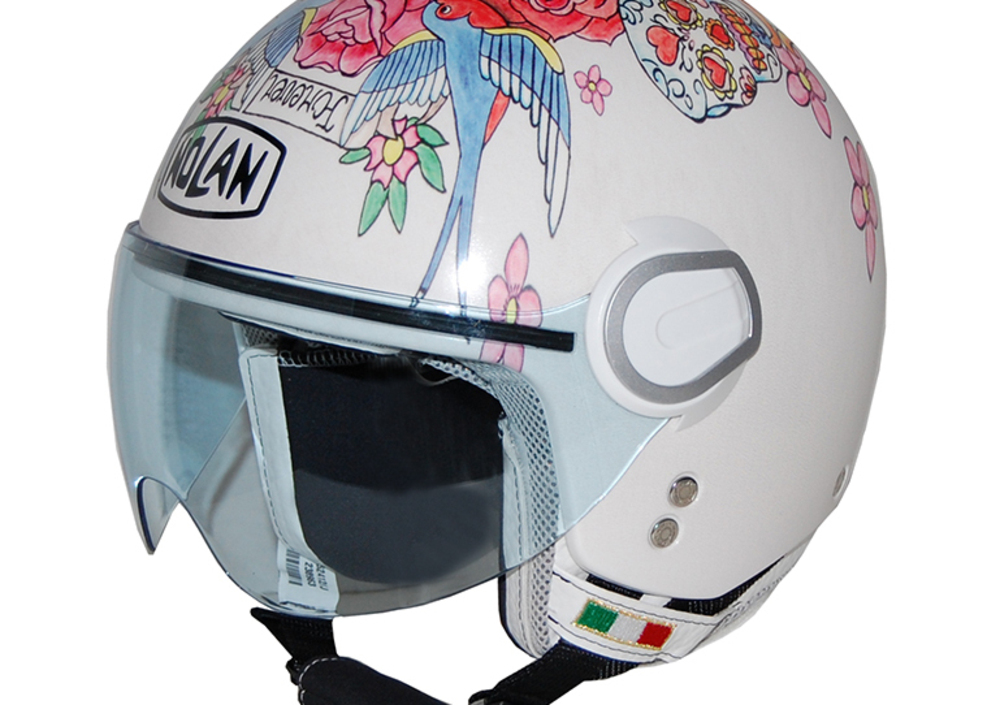 Tre caschi Nolan (modello N20) sono stati personalizzati con le opere di tre dei 26 vincitori del concorso. Stili completamente diversi, ma che per temi e colori valorizzano le linee di questo casco demi-jet pensato per gli scooteristi cittadini amanti della moda.