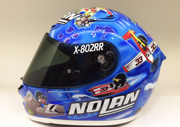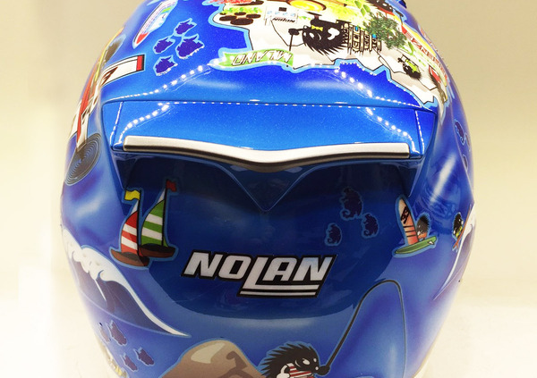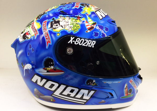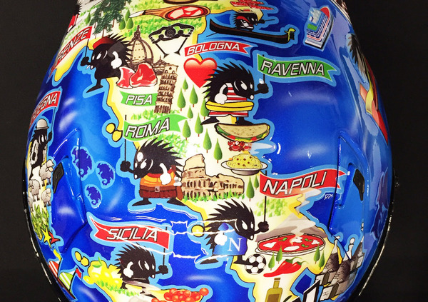 Dopo il suo ritorno in Superbike, Marco Melandri celebra la prima tappa italiana del campionato scendendo in pista con una versione speciale del suo casco Nolan X-802RR. Il simpatico riccio portafortuna di Marco diventa un turista, e va alla scoperta dei capoluoghi d’Italia mettendone in evidenza i simboli più famosi. A far da sfondo, il blu del mare che circonda la nostra penisola.