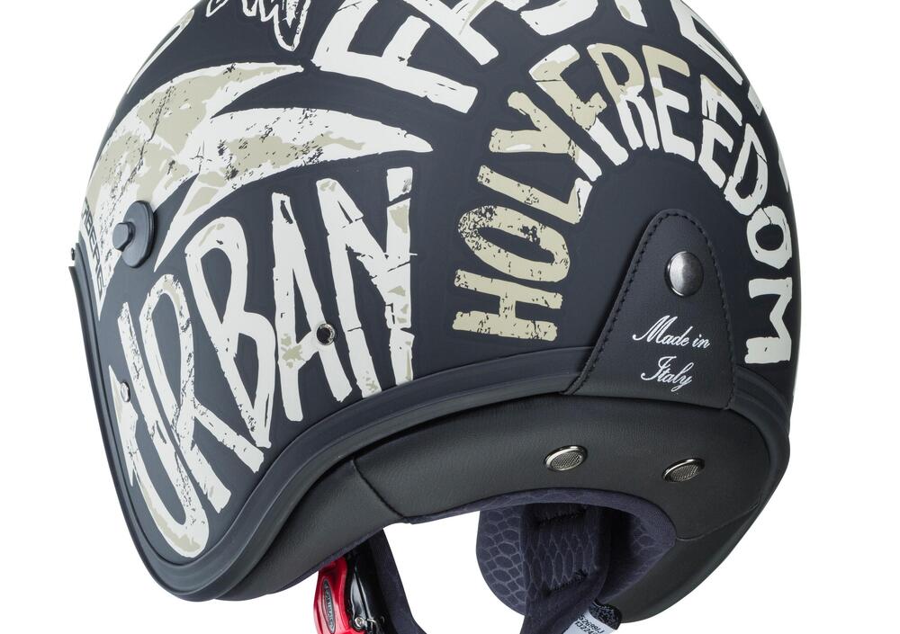 Le finiture sono tutte Made in Italy come i cinque rivetti affogati nel bordo calotta, le prese d'aria in acciaio inserite nel paranuca e gli inserti in pelle.