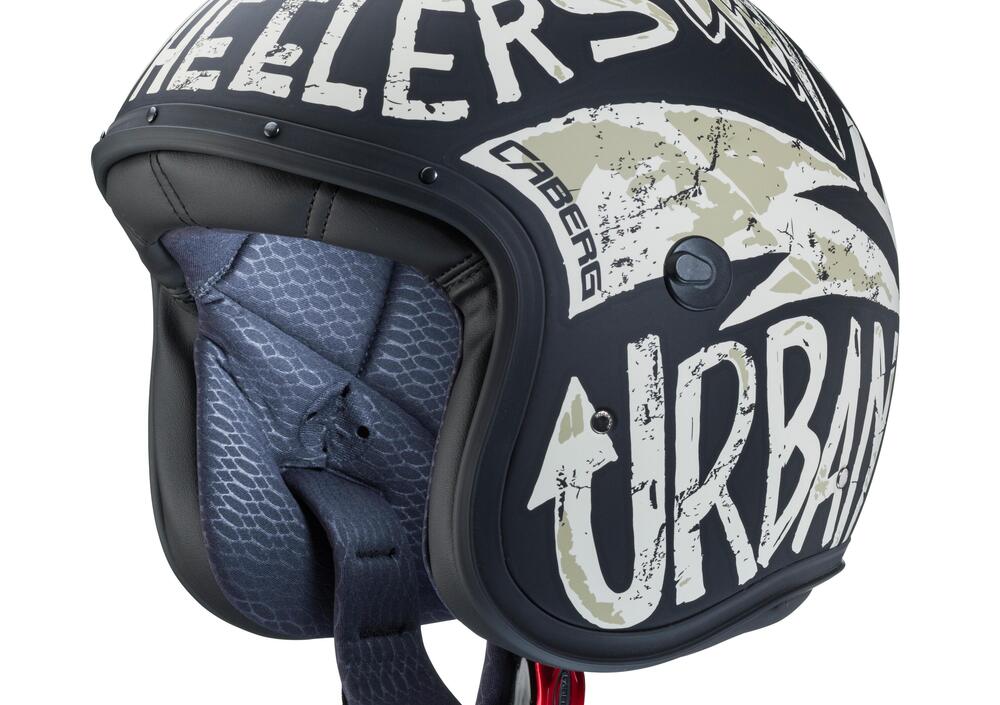 Gli interni del casco jet by Caberg sono realizzati con tessuti traspiranti e pelle inoltre si possono estrarre facilmente per essere lavati, Freeride Nuke ha un sistema di chiusura a fibbia a regolazione micrometrica ed è omologato Ece 22.05.
