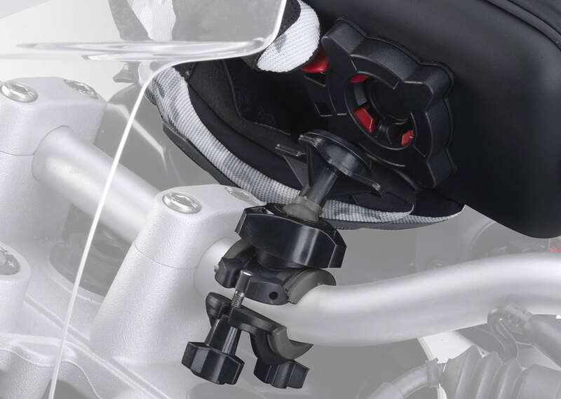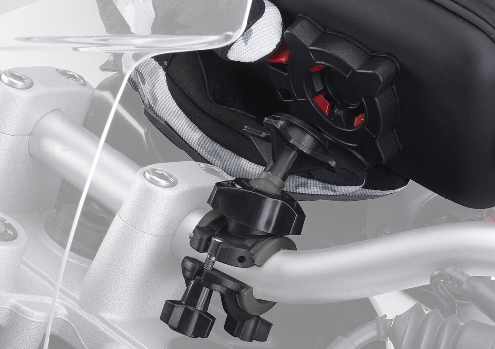 Lo smartphone o il GPS si fissa all’interno tramite cinghiette con velcro e spessori in EVA che assorbono efficacemente le sollecitazioni in presenza di fondi stradali sconnessi o dovute alle vibrazioni innescate dal veicolo. In caso di pioggia basta utilizzare la copertina waterproof in dotazione.