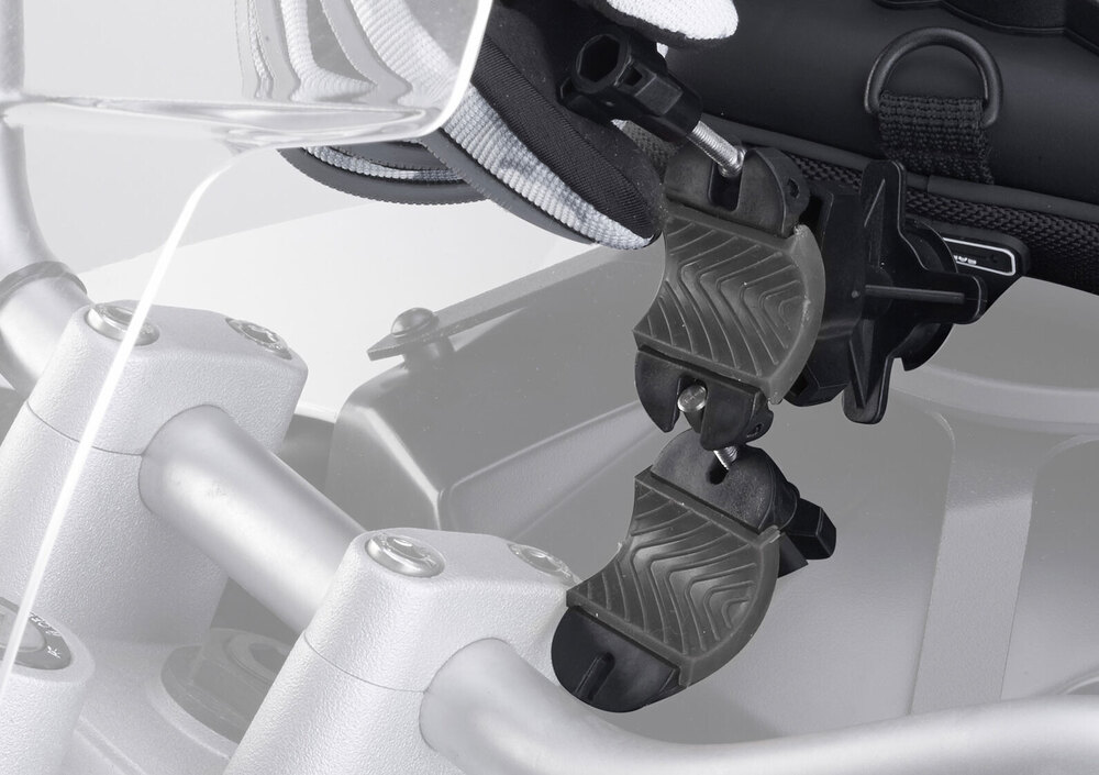 I modelli KAPPA dispongono di un aggancio/sgancio di tipo rapido. In dotazione viene fornito un sistema di fissaggio a morsetto, dotato di parti in gomma e strutture che permettono di ottenere una presa salda anche su manubri con sezioni geometriche differenti da quella tubolare classica.