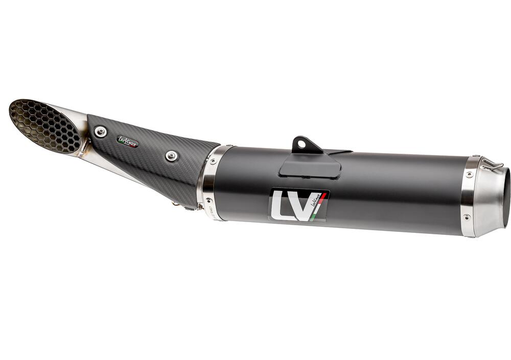 L’uscita è valorizzata da un carter paracalore full carbon con logo LeoVince, e termina con una rete a nido d’ape, ispirata al mondo racing.