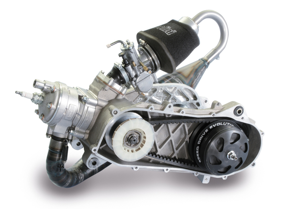 Sistema di fissaggio del cilindro a flangia. Due i Cilindri fusi in lega leggera raffreddati ad acqua uno Ø47,6 e uno Ø50 direttamente derivati dal motore Polini 125 GP che ha gareggiato nel Mondiale Velocità. Passaggio interno del liquido di raffreddamento mediante sistema Close Deck. Canna con riporto nichel-silicio. Cinque luci di travaso caratterizzate da diagramma particolarmente performante. Luce di scarico con traversino centrale per ottimizzare l’evacuazione dei gas di scarico. Pistone fuso per gravità in lega leggera ad alto tenore di silicio con segmento cromato.