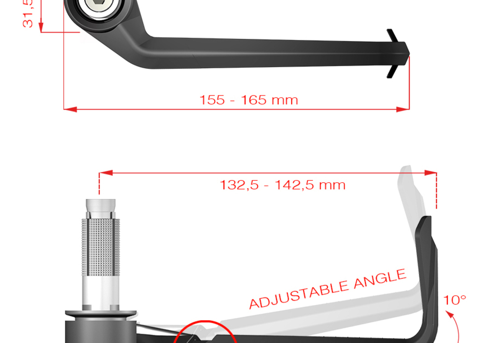 E' sviluppato con la possibilità di regolare l'angolazione fino a 10 gradi e la lunghezza estendibile fino a 10 mm per ottimizzare l'installazione sulla moto.