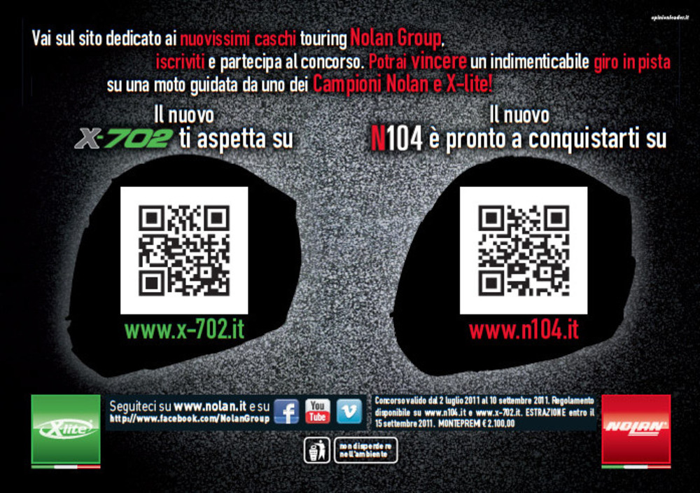 Agli indirizzi www.n104.it e www.x-702.it si accede ai due siti dedicati alla preview dei nuovissimi caschi Touring. A quel punto è sufficiente iscriversi per partecipare al concorso: “Sali in sella con i campioni Nolan Group”. Tutti avranno l’opportunità di essere estratti e vincere un giro in pista in sella ad una moto guidata da Stoner, Lorenzo, Checa o Melandri. Un’occasione imperdibile per gli appassionati di MotoGp e Superbike che potranno conoscere dal vivo i loro beniamini e provare sulla loro pelle il brivido della velocità.